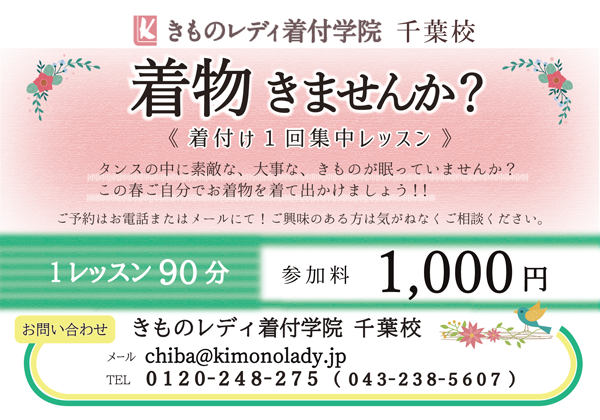 - 受講料は無料になりますが、テキストを使用しての授業となっておりますので、『テキスト代・教室管理費』として2,800円(税込み)が必要となります。お着物はご自分でお持ちのものでOKです。ご購入の必要はありません。また、講座開催中の着物の販売等も、一切ありませんのでご安心下さい。着物や帯をお持ちでない方にはレンタルセット(有料)もございます。(※肌に直接身につける肌襦袢などはご用意をお願いします。ご希望であれば教室で購入も可能です。)