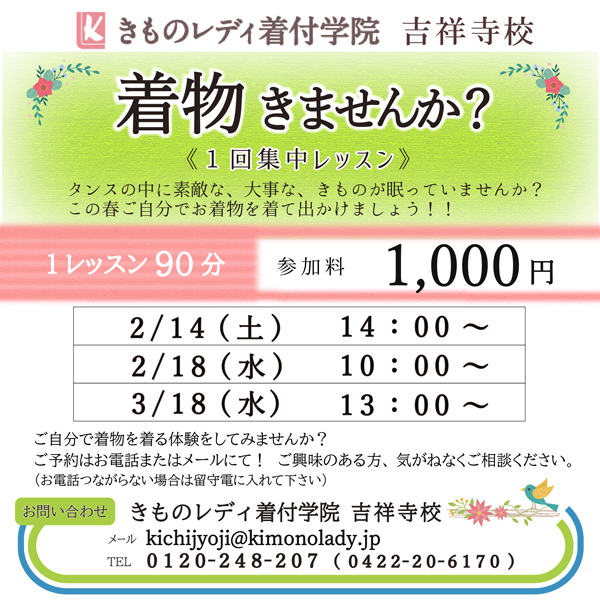 - 受講料は無料になりますが、テキストを使用しての授業となっておりますので、『テキスト代・教室管理費』として2,800円(税込み)が必要となります。お着物はご自分でお持ちのものでOKです。ご購入の必要はありません。また、講座開催中の着物の販売等も、一切ありませんのでご安心下さい。着物や帯をお持ちでない方にはレンタルセット(有料)もございます。(※肌に直接身につける肌襦袢などはご用意をお願いします。ご希望であれば教室で購入も可能です。)